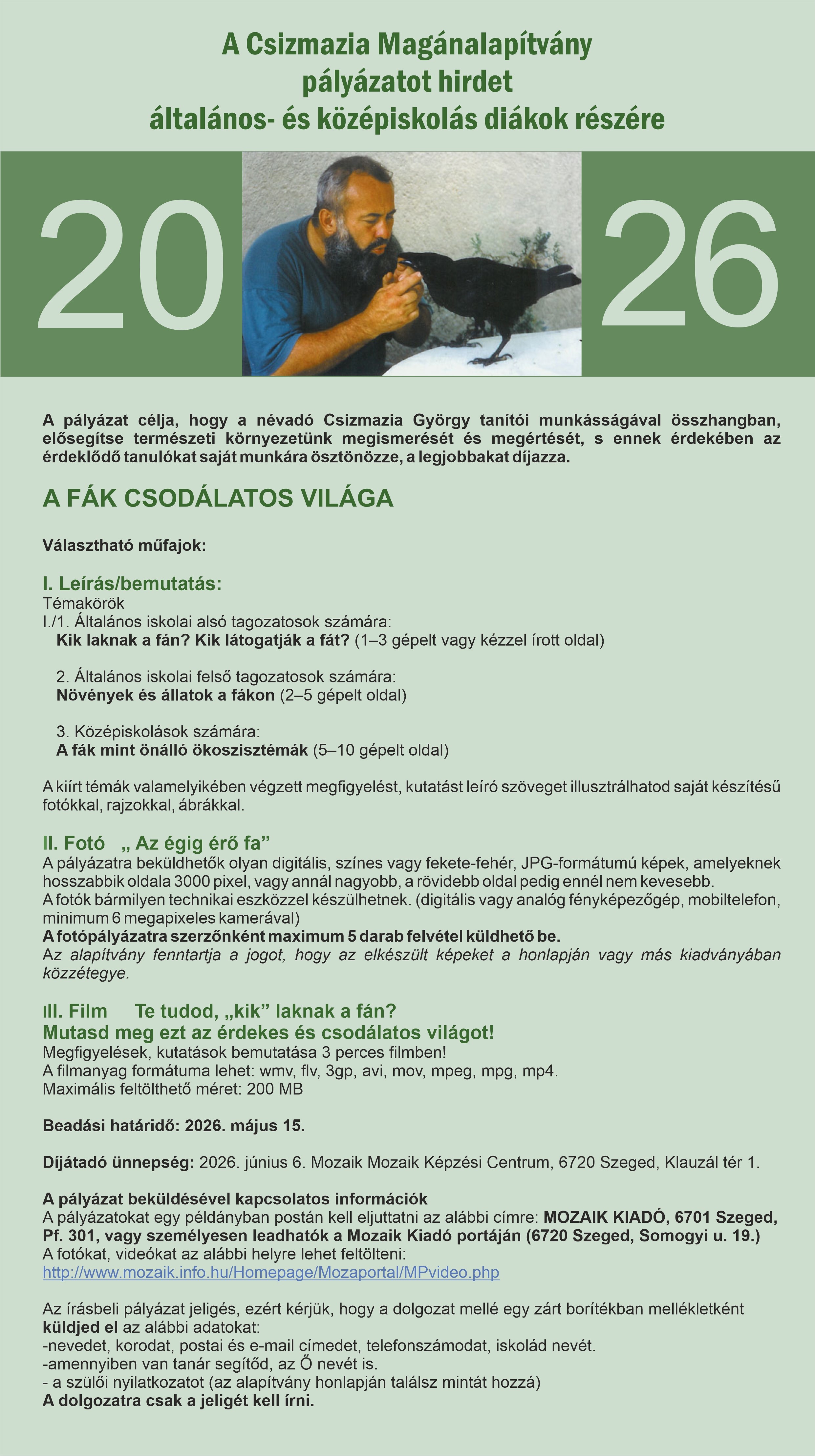 A beadás módja: A pályázatokat egy példányban kell eljuttatni postai úton a MOZAIK KIADÓ 6701 Szeged, Pf. 301 címre. A Csizmazia György emlékkönyvébe szánt írásokat az alábbi e-mail címre kérjük továbbítani: csizmazia@mozaik.info.hu